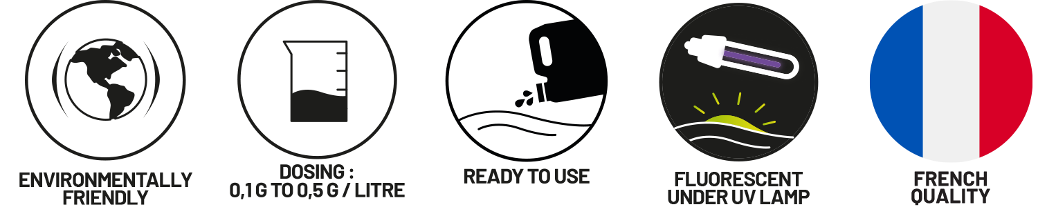 • Recommended dosage : 0.1 to 0.5 g/L of water. For closed circuits or very small volumes, start with the minimum dose and adjust according to visibility.