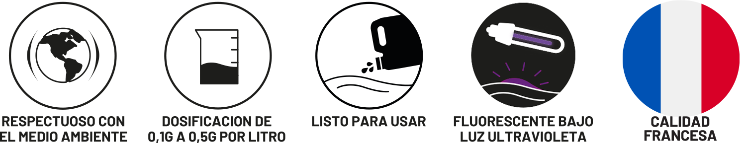 • Dosificación Recomendada 0,1 g a 0,5 g por litro de agua (aproximadamente 1 g para 10 litros), según la intensidad de fluorescencia deseada y la configuración de la prueba.